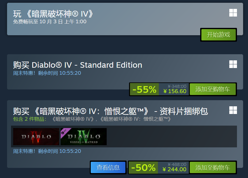 《暗黑破坏神4》支持简体中文,从商城看到,免费仅限游戏本体,资料片“憎恨之躯”依然要付费。目前Steam版的游戏本体和资料片捆绑包正在周末特惠打5折,分别售价156元和244元。虽然游戏褒贬不一,这个价格已经跟国服的暗黑2差不多。值得一提是,Steam秋季特卖即将开启,届时可能会有更长时间的暗黑4打折活动。