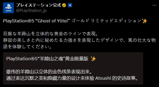 今日,PlayStation日本分部官方发文宣传了《羊蹄山之魂》主题的限定款PS5主机。官方介绍表示,PS5版是用立体的金色线条勾勒出庄严的羊蹄山。这一设计展现了静谧之美与内在的力量,请尽情体验笃的宏大物语。